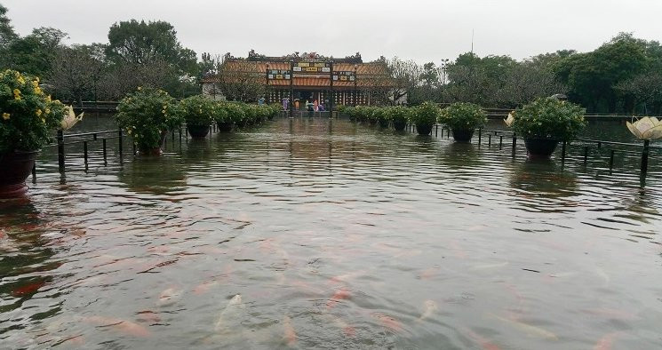 Chiều 7/11, ghi nhận của PV VTC News tại Đại Nội Huế (TP Huế), nước lũ cũng gây ngập tại một số sân, vườn trong di tích này.