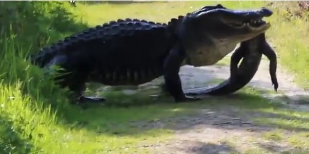 Một con cá sấu khổng lồ bò từ trảng cỏ dài ra con đường mòn ở Lakeland, Florida,Mỹ, với cá sấu non nhỏ hơn ngoạm ngang miệng, theo Daily Star.