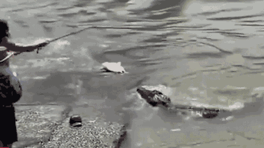 Cần thủ vừa câu được một con cá to tại Vườn quốc gia Kakadu, Australia, cá sấu gần đấy thấy vậy liền đuổi theo cướp nhưng bất thành.