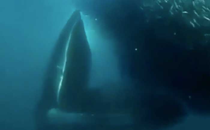 Một nhà lặn biển đã ghi lại cảnh một chú cá voi đang săn mồi, nó mở miệng và nó nuốt chửng đàn cá một cách nhanh chóng.