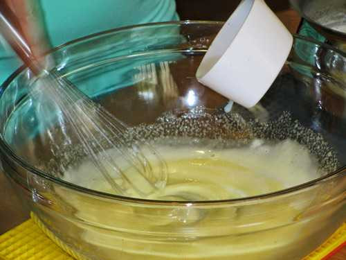 Bước 1: Đánh trứng với 1/4 chỗ đường trắng thật đều đến khi trứng chuyển sang màu vàng nhạt.