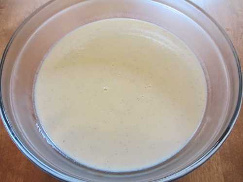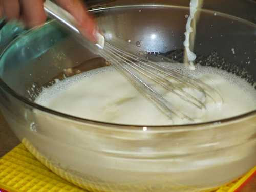Bước 4: Từ từ múc từng ít sữa nóng một vào bát trứng, một tay múc sữa một tay khuấy đều. Làm như vậy trứng sẽ không bị chín.
