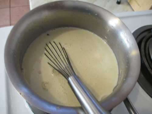 Bước 5: Cho hỗn hợp trứng sữa đó vào cái nồi ban đầu và đặt lên bếp đun. Bật lửa nhỏ đun đến khi sữa đặc lại là xong. Trong thời gian đun cứ liên tục khuấy đều, mất khoảng 7 phút.
