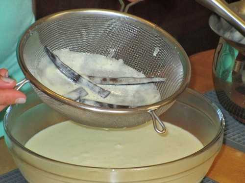 Bước 6: Đổ hỗn hợp sữa đó ra một cái giá để lọc phần hạt và phần vỏ vanilla. Sau đó cho bát sữa đặc đó vào tủ lạnh để ít nhất 2 tiếng hoặc qua đêm cho bát sữa đó thật lạnh.