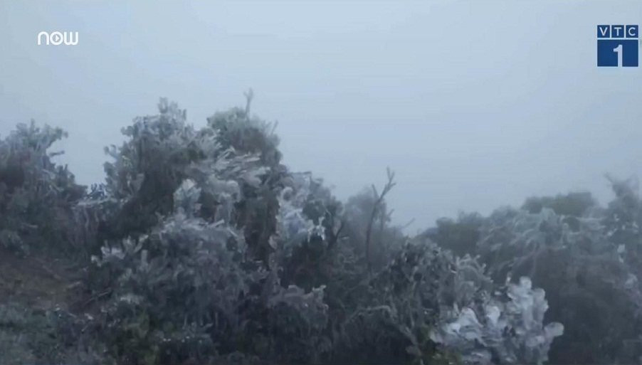 Băng tuyết phủ trắng đỉnh Mẫu Sơn (huyện Lộc Bình, tỉnh Lạng Sơn) khi nhiệt độ tiếp tục giảm sâu xuống còn -1°C.
