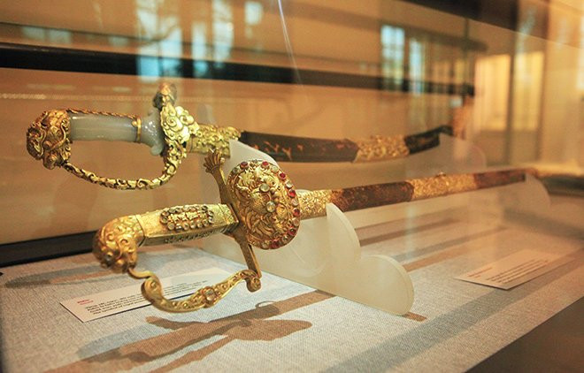 Hai cây kiếm của vua Khải Định có chuôi vàng nạm đá quý, vỏ đồi mồi bọc vàng, chạm khắc tinh xảo đang được lưu giữ tại Bảo tàng Lịch sử Quốc gia, Hà Nội.