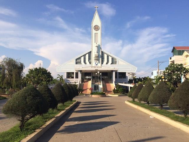 Nhà thờ Giáo xứ Nữ vương Hoà Bình trên đường Lê Đức Thọ (Gò Vấp, TP.HCM) được “thần đèn” Nguyễn Văn Cư và cộng sự nâng lên cao 2 mét, ước tính công trình nặng khoảng 5.500 tấn.