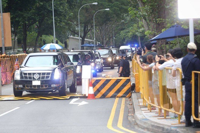 27/02/2019 11:13:00 +07:00Vào lúc 10h45, đoàn xe chở Tổng thống Mỹ rời khách sạn Marriott từ cổng sau và hướng đến Phủ Chủ tịch.