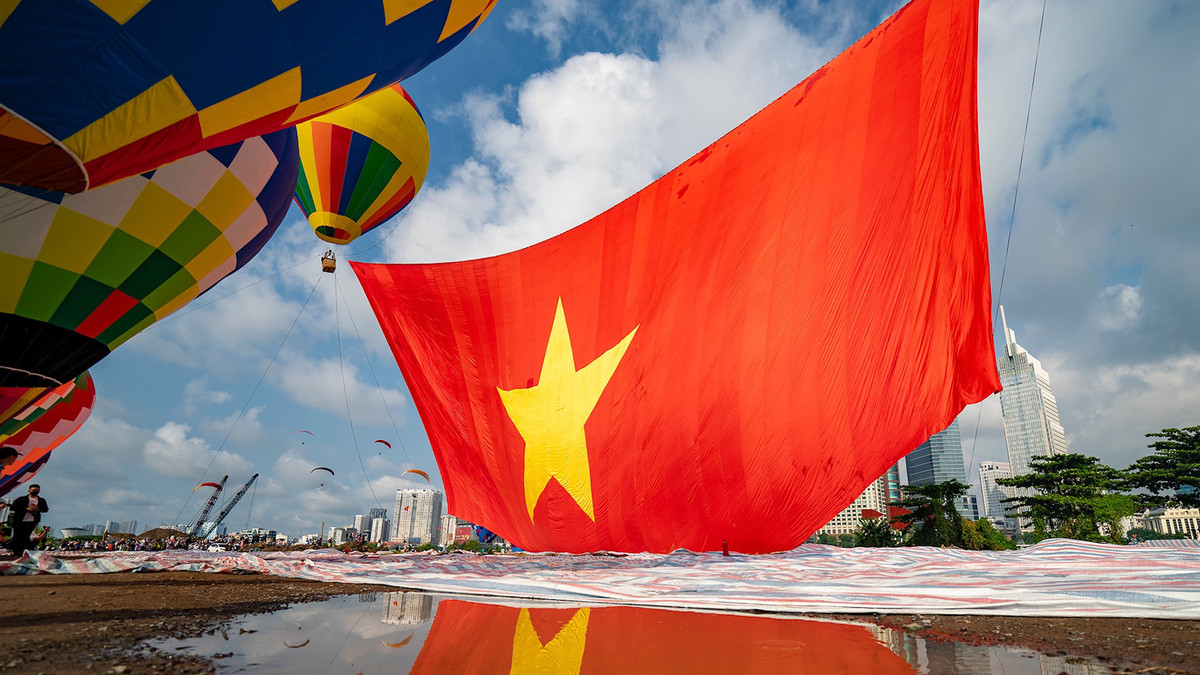 Sáng 2/9, dàn khinh khí cầu ở TP.HCM kéo đại kỳ rộng 1.800 m2 bay lên bầu trời, chào mừng ngày Quốc khánh.