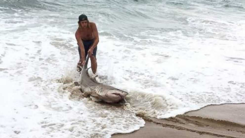 Sau một loạt vụ cá mập tấn công ở bãi biển North Carolina, người dân nơi đây lại được chứng kiến cảnh hai người đàn ông túm đuôi, lôi một con cá mập sống lên bờ