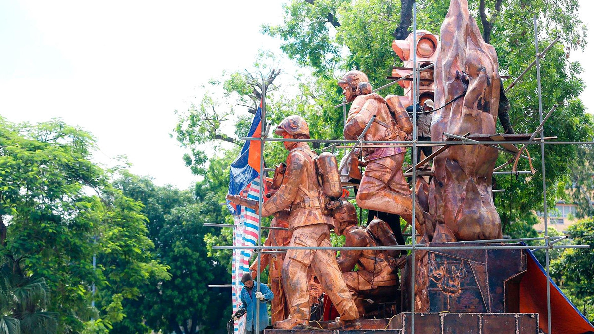 Tượng đài gồm 2 chiến sĩ Cảnh sát giao thông, 3 chiến sĩ Phòng cháy chữa cháy, 1 phụ nữ lớn tuổi và 1 trẻ em đang được thi công tại Công viên Thống Nhất (Hà Nội).