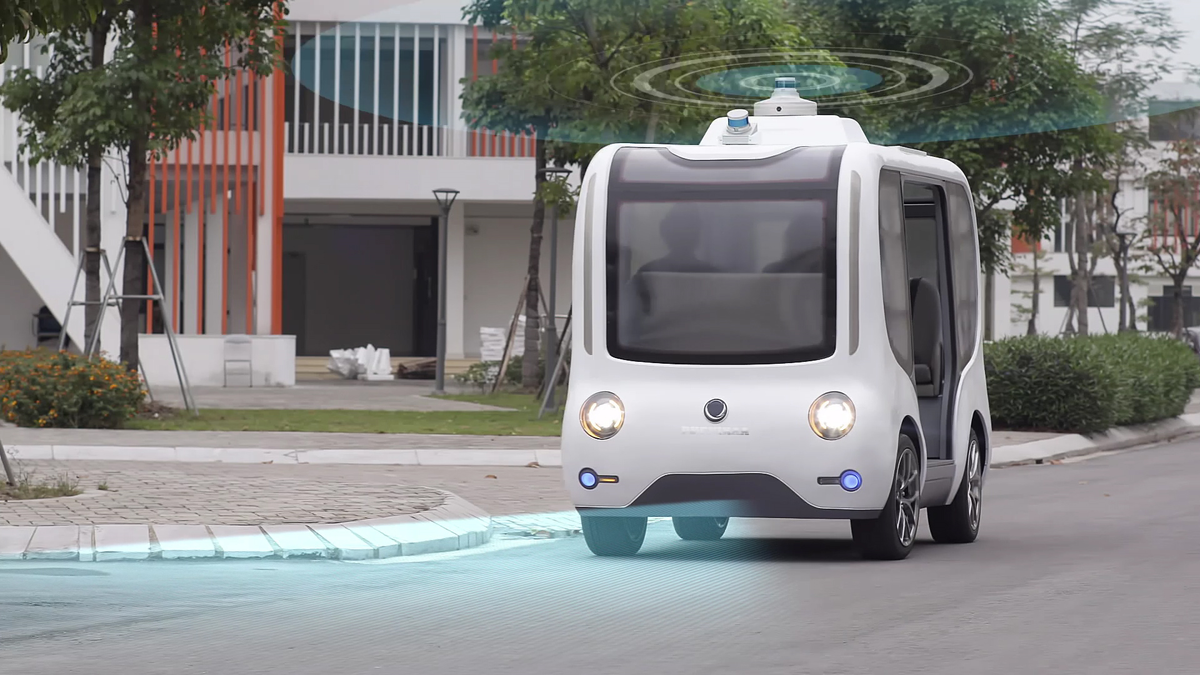 Xe tự hành không có tay lái,được gắn cảm biến 360 độ có tác dụng nhận dạng vật cản, phía sau cảm biến xe có một ăng ten GPS hỗ trợ định vị trong không gian.