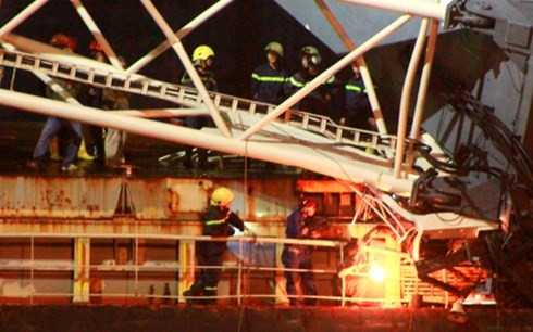 (VTC News) - Khoảng 23h30 tối 24/11, trong lúc bốc dỡ hàng cho tàu Fortune Navigator của Công ty cổ phần vận tải biển Việt Nam (Vosco), một chiếc cần cẩu trọng tải hàng trăm tấn của Cảng Tân Thuận bất ngờ gãy đôi, đổ sập đè lên hầm của con tàu này.
