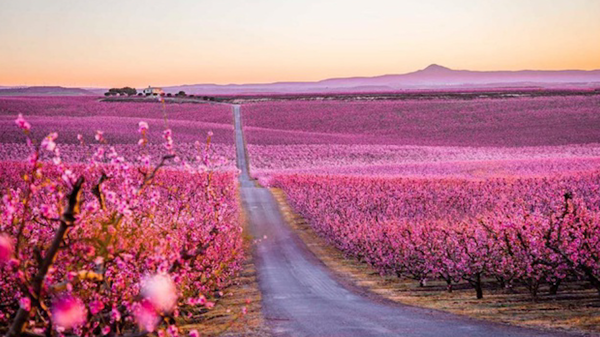 Cánh đồng hoa anh đào ở Aitona, xứ Catalonia, Tây Ban Nha nở rộ một cách ngoạn mục, thu hút du khách tham quan, chụp ảnh.