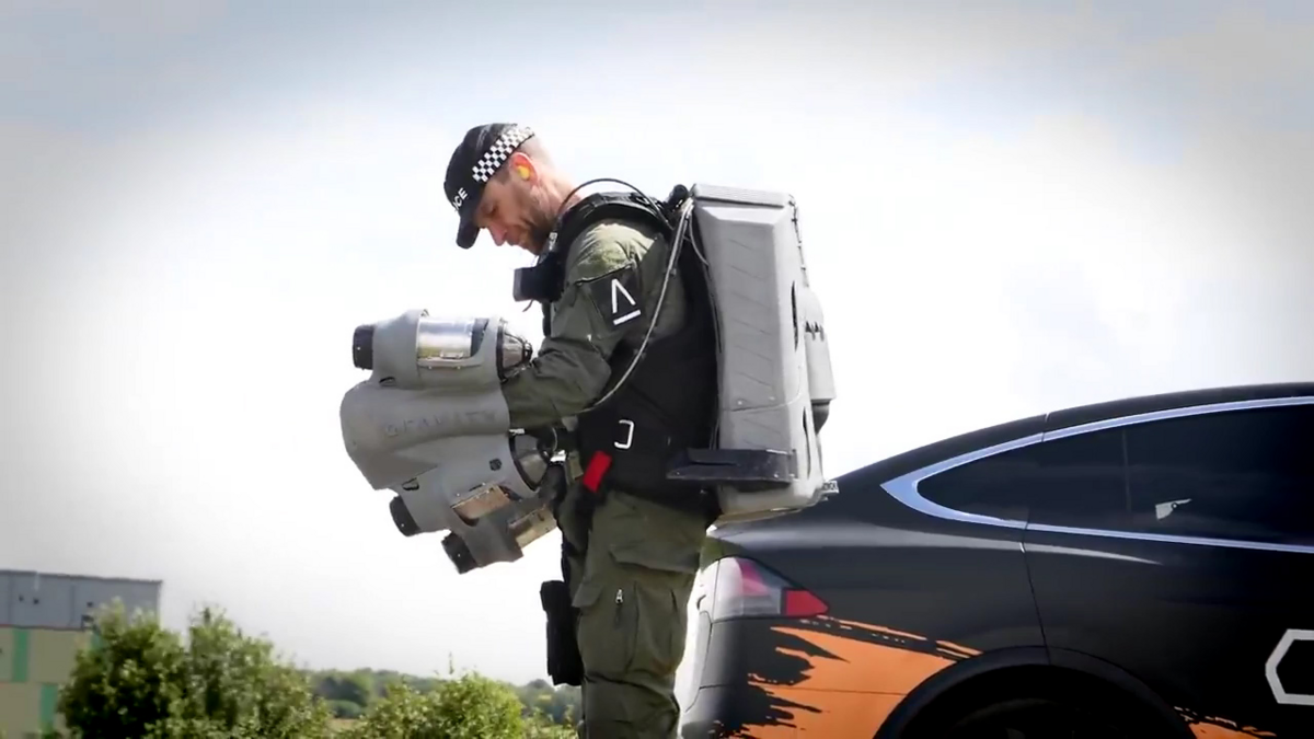 Cảnh sát Anh sử dụng bộ đồ bay gắn động cơ phản lực để truy bắt một người đàn ông mang súng trong thử nghiệm mô phỏng.