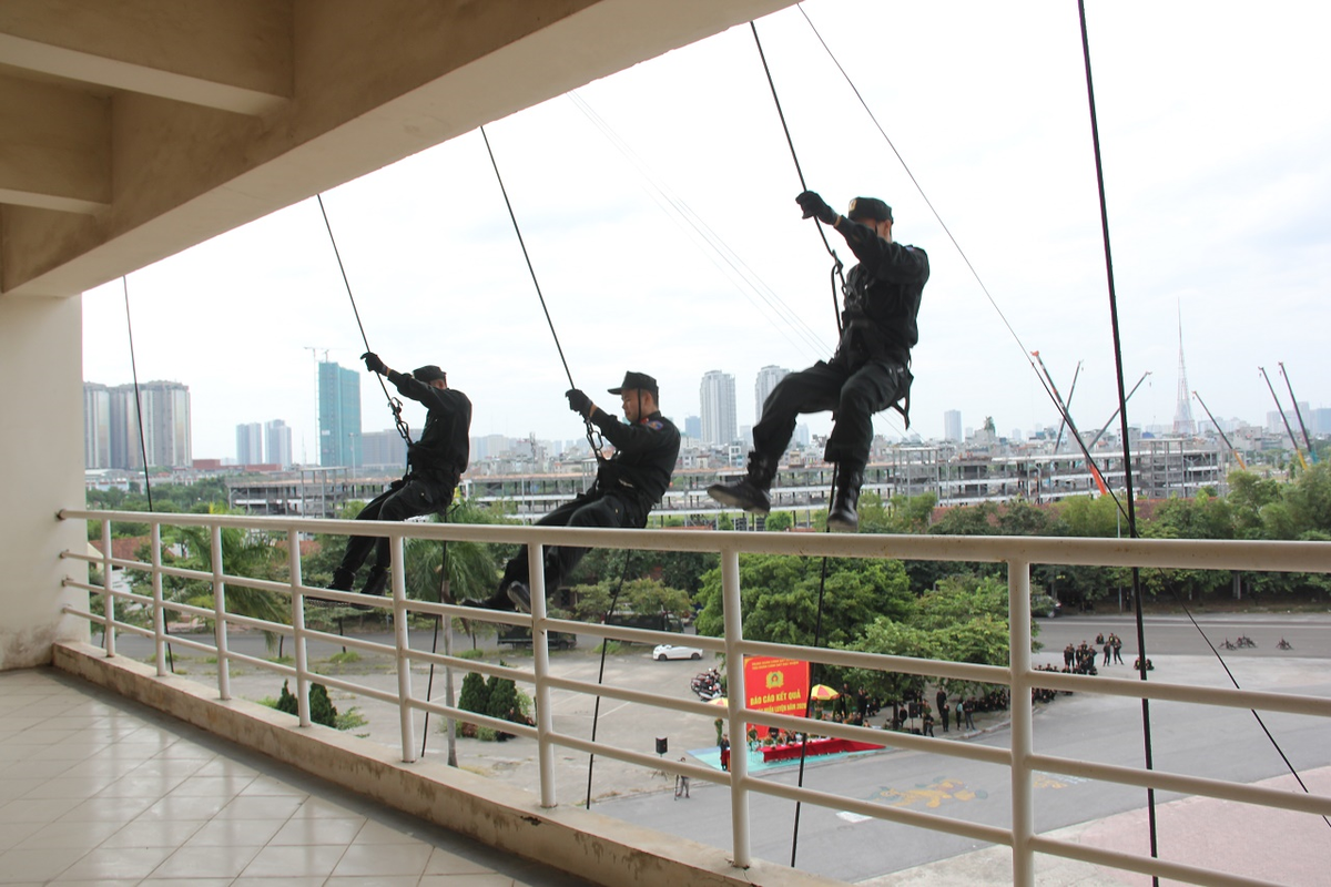 140 chiến sĩ thuộc tiểu đoàn Cảnh sát đặc nhiệm, trung đoàn Cảnh sát cơ động Thủ đô, thể hiện kỹ năng đu dây từ độ cao 15m trong buổi diễn tập tiêu diệt mục tiêu.