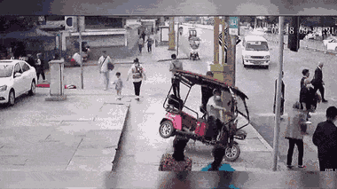 Người đàn ông lái xe 3 bánh tại Tứ Xuyên, Trung Quốc khi xuống bậc thềm thì mất kiểm soát xe lao về phía cụ bà, một cảnh sát phản ứng nhanh, dùng tay chặn chiếc xe.