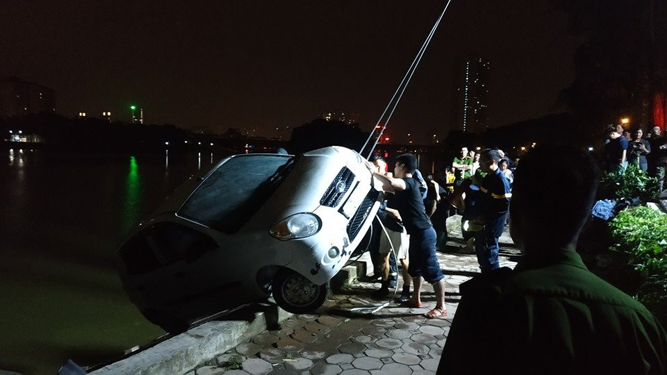 Chiếc xe ô tô 4 chỗ chạy qua khu vực hồ Linh Đàm (quận Hoàng Mai, Hà Nội) bất ngờ bị mất lái đã lao qua hàng rào và bờ kè đá sau đó xuống hồ.