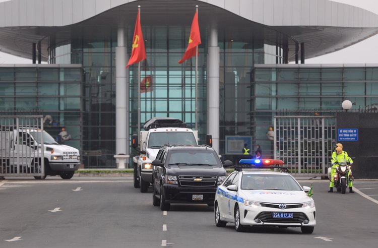 23/02/2019 17:36:00 +07:005 ô tô chở thiết bị bảo vệ Tổng thống Donal Trump được lái bởi nhân viên an ninh Mỹ từ sân bay tập kết về khách sạn ở khu vực Mỹ Đình (Hà Nội).