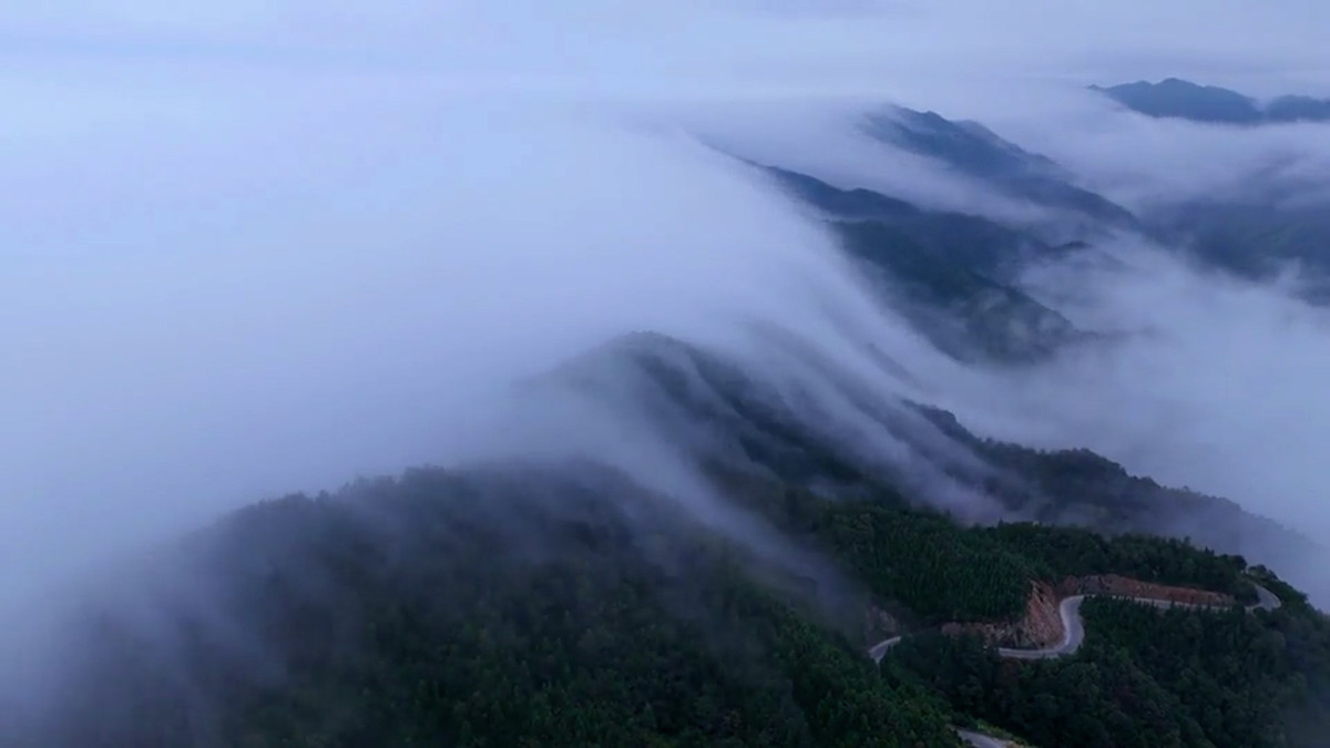 Hình ảnh biển mây chảy xuống các dãy núi giống như một thác nước được nhiếp ảnh gia dùng flycam quay lại tại thành phố Chu Châu, tỉnh Hồ Nam, Trung Quốc.