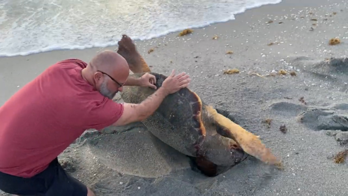 Cặp vợ chồng vừa giải cứu rùa biển lên bờ đẻ trứng nhưng không may bị sóng cuốn lật trên cát tại bãi biển Jupiter, Florida, Mỹ.