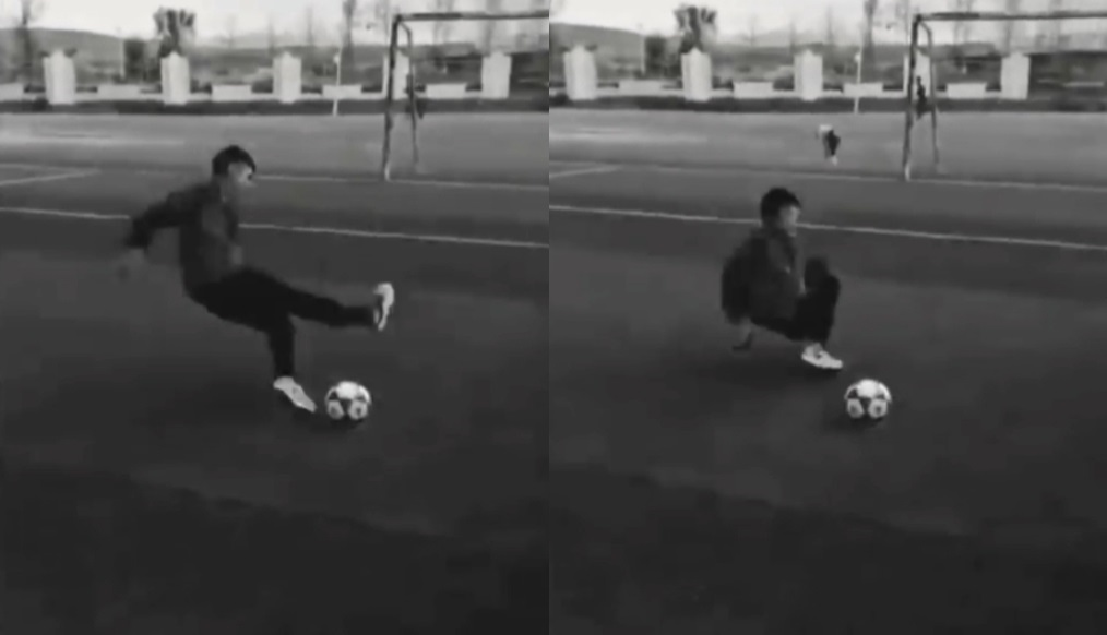 Sau vài vòng quay tròn ra vẻ nguy hiểm, chàng cầu thủ tung chân sút bóng nhưng bóng vẫn nằm nguyên còn chiếc giày lại bay vút đi.