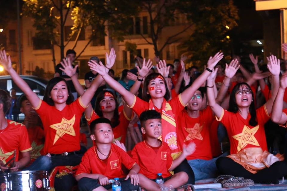 Hàng trăm CĐV Hà Nội có mặt ở sân Trung tâm thương mại Hoàng Ngân (Trung Hòa, Cầu Giấy, Hà Nội) vỡ òa cảm xúc sau bàn thắng vào lưới Philippines của Anh Đức trong trận bán kết lượt đi AFF Cup 2018.