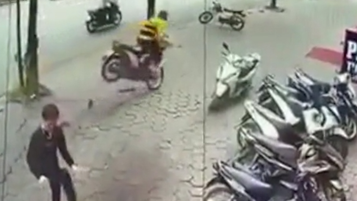 Đang chạy với tốc độ cao trên vỉa hè, nam thanh niên mặc áo xe ôm công nghệ bất ngờ lộn vòng trên không rồi ngã cắm mặt xuống đường.