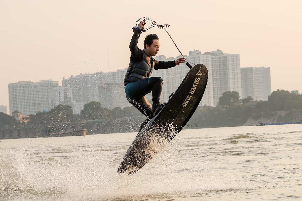 Nhiều người đam mê môn lướt ván ở Hà Nội mạnh tay chi hơn 150 triệu đồng để sở hữu ván phản lực gắn động cơ đẩy, sức nâng 100 kg.