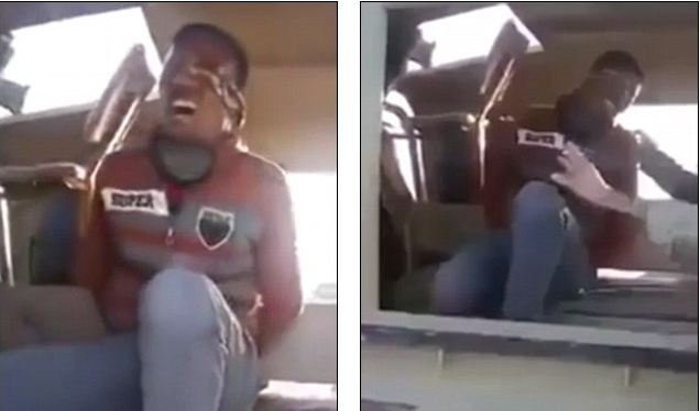 Trong trang phục thường dân, hai tay bị trói, mắt bị che, tù binh này ngồi ở phía sau xe tải và liên tục khóc lóc rên rỉ.