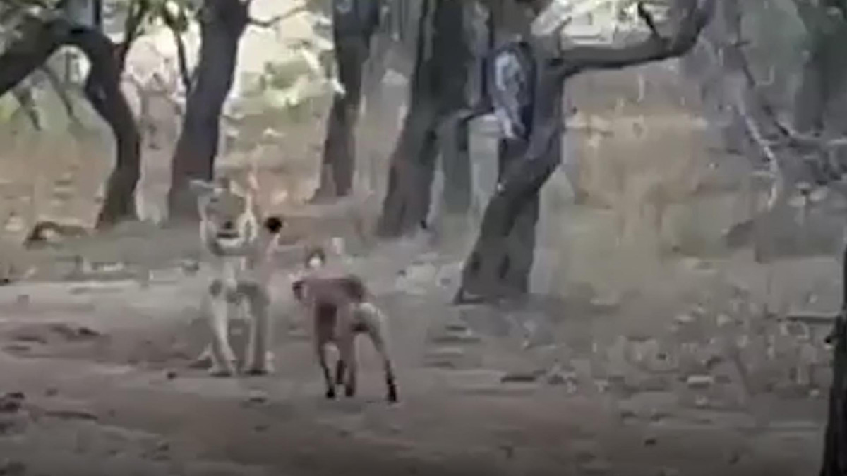 Dù chỉ bằng nửa kích cỡ của sư tử nhưng chú chó hoang không hề lo sợ, liên tục lao vào sủa và tấn công đối phương tại công viên quốc gia Gir, bang Gujarat, Ấn Độ.