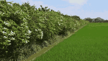 Nông dân Nguyễn Quốc Hùng (Thoại Sơn, An Giang) trồng giàn hoa giấy dài 500m làm hàng rào để bảo vệ vườn bưởi khỏi kẻ trộm.