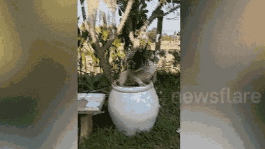 Chú chó đáng yêu tự trèo lên chiếc lu đựng nước và nhảy vào tắm mát khi nhiệt độ ngoài trời tại tỉnh Nong Khai, Thái Lan lên 34 độ C.