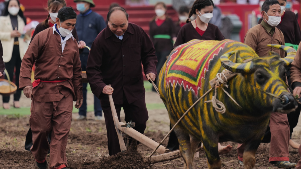 Chủ tịch nước Nguyễn Xuân Phúc cùng người dân xuống ruộng đi cày tại lễ hội Tịch điền Đọi Sơn, Duy Tiên,Hà Nam sáng 7/2.