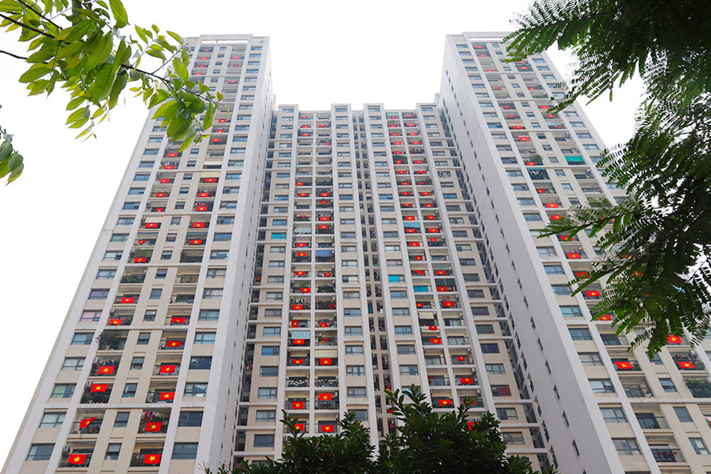 Chung cư trên đường Tam Trinh, quận Hoàng Mai, TP Hà Nội đồng loạt treo cờ Tổ quốc thể hiện tinh thần chung tay chiến thắng đại dịch COVID-19.