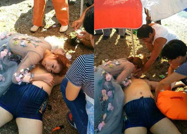 Sự việc xảy ra tại bãi biển Đại Liên, tỉnh Liêu Ninh (Trung Quốc) sáng 21/9 khi cô gái xinh đẹp đang trong buổi chụp ảnh cưới với vị hôn phu. Cùng lúc đó, một người đàn ông bị đuối nước được người dân đưa lên bờ. Người đàn ông này bị lên cơn đau tim đột ngột trong khi bơi.