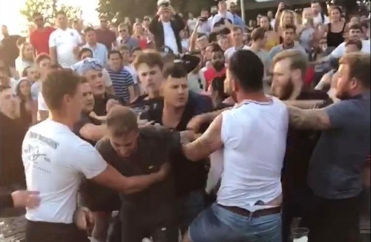 Vụ ẩu đả xảy ra ở thị trấn Chatham, hạt Kent, Anh tại một quán bia có rất đông CĐV tụ tập xem đội tuyển Anh thi đấu. Tuy nhiên thay vì cùng nhau ăn mừng chiến thắng, họ lại lao vào đánh nhau. Một CĐV mặc chiếc áo đấu màu đỏ của đội tuyển Anh bị đẩy ngã xuống mặt đất nhưng đám đông tiếp tục xông vào đánh túi bụi.