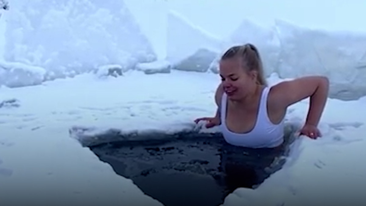 Elina Makinen, 27 tuổi, đến từ Phần Lan, khởi động ngày mới bằng cách ngâm mình trong hố băng ngoài trời, giữa nền nhiệt đang hạ sâu.