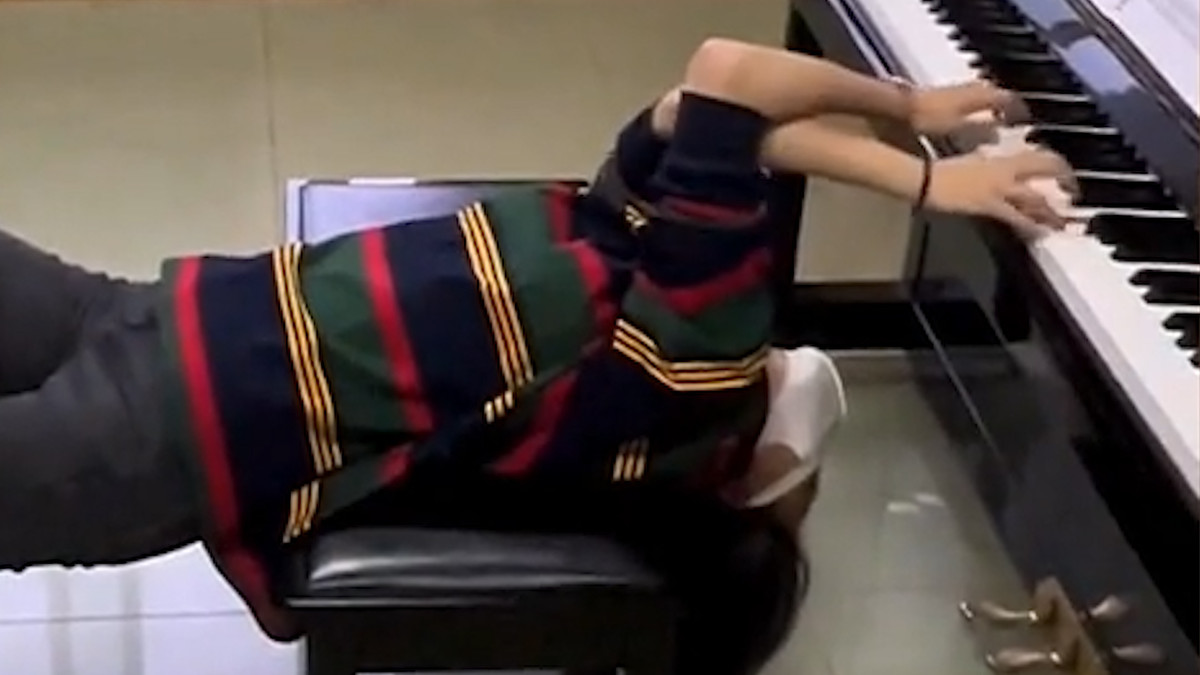 Tránh nhàm chán, cô gái tên Shen tại Thiểm Tây (Trung Quốc) đã nghĩ ra ý tưởng nằm lộn ngược trên ghế để chơi đàn piano.