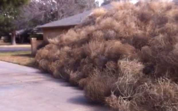 Sau một cơn lốc thường thấy trên sa mạc, ngôi nhà của Josh Pitman đã gần như bị bao phủ bởi hàng trăm bụi cỏ ma đặc biệt này. Đám cỏ ma xuất hiện nhiều sau khi tốc độ gió tăng lên đến 96 km/h ở vùng Midland, Texas.