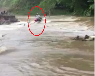 Hình ảnh người đàn ông chạy xe máy qua đập tràn bị nước cuốn trôi. (Ảnh chụp màn hình)