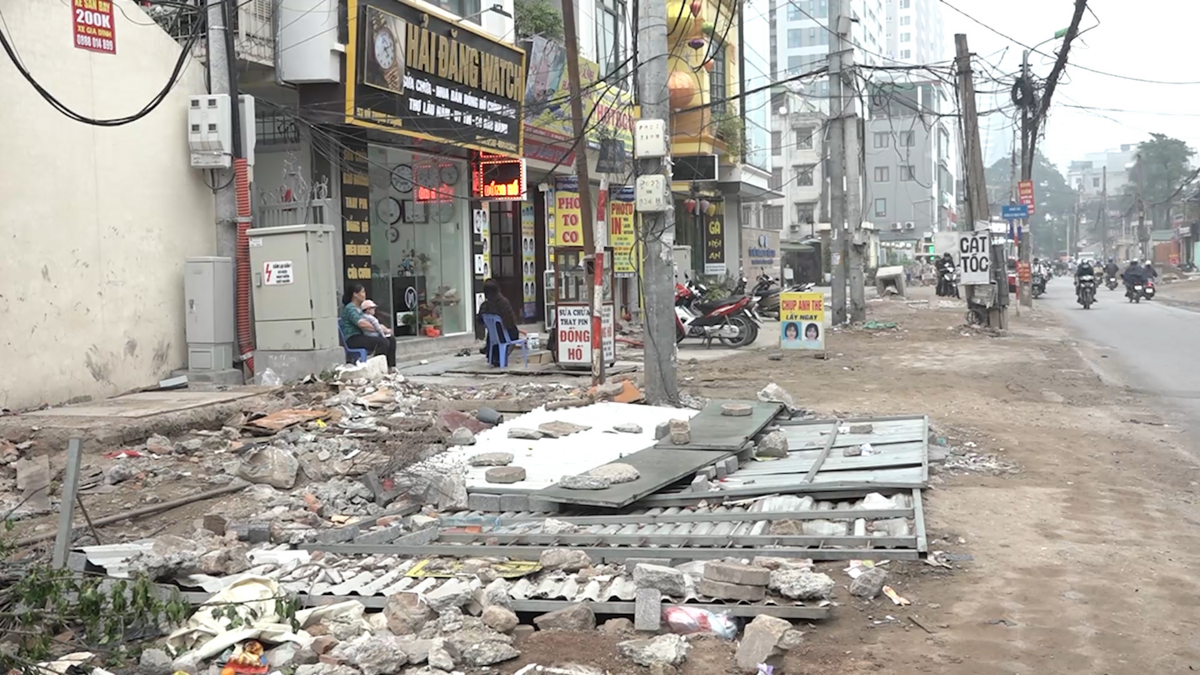 Đường Vũ Trọng Phụng (quận Thanh Xuân, TP. Hà Nội) ngổn ngang vật liệu xây dựng, cột điện nằm giữa đường...khiến nhiều người gặp khó khăn khi di chuyển qua đây.