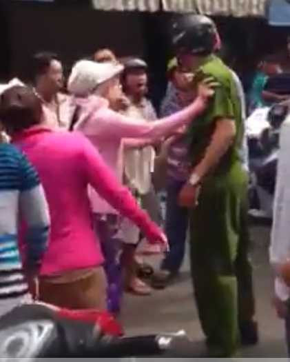 | Nhiều phụ nữ lao vào can ngăn hành động đánh người của chiến sỹ công an. Ảnh chụp từ video clip |