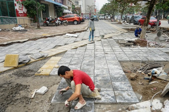 Nhóm thợ đổ lớp bê tông dày 5 cm trước khi lát gạch mới trên các tuyến vỉa hè ở quận Cầu Giấy và quận Tây Hồ.
