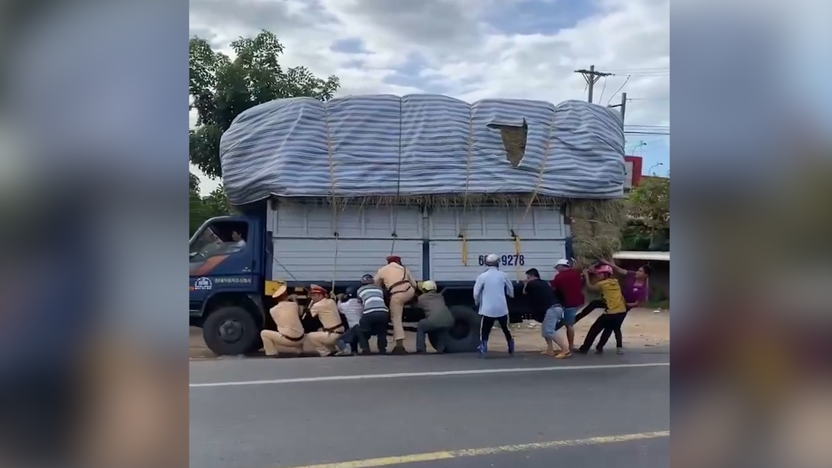 Trên mạng xã hội xuất hiện đoạn video ghi lại CSGT cùng người dân giúp một chiếc xe chở quá khổ, quá tải chuẩn bị lật trên đường.