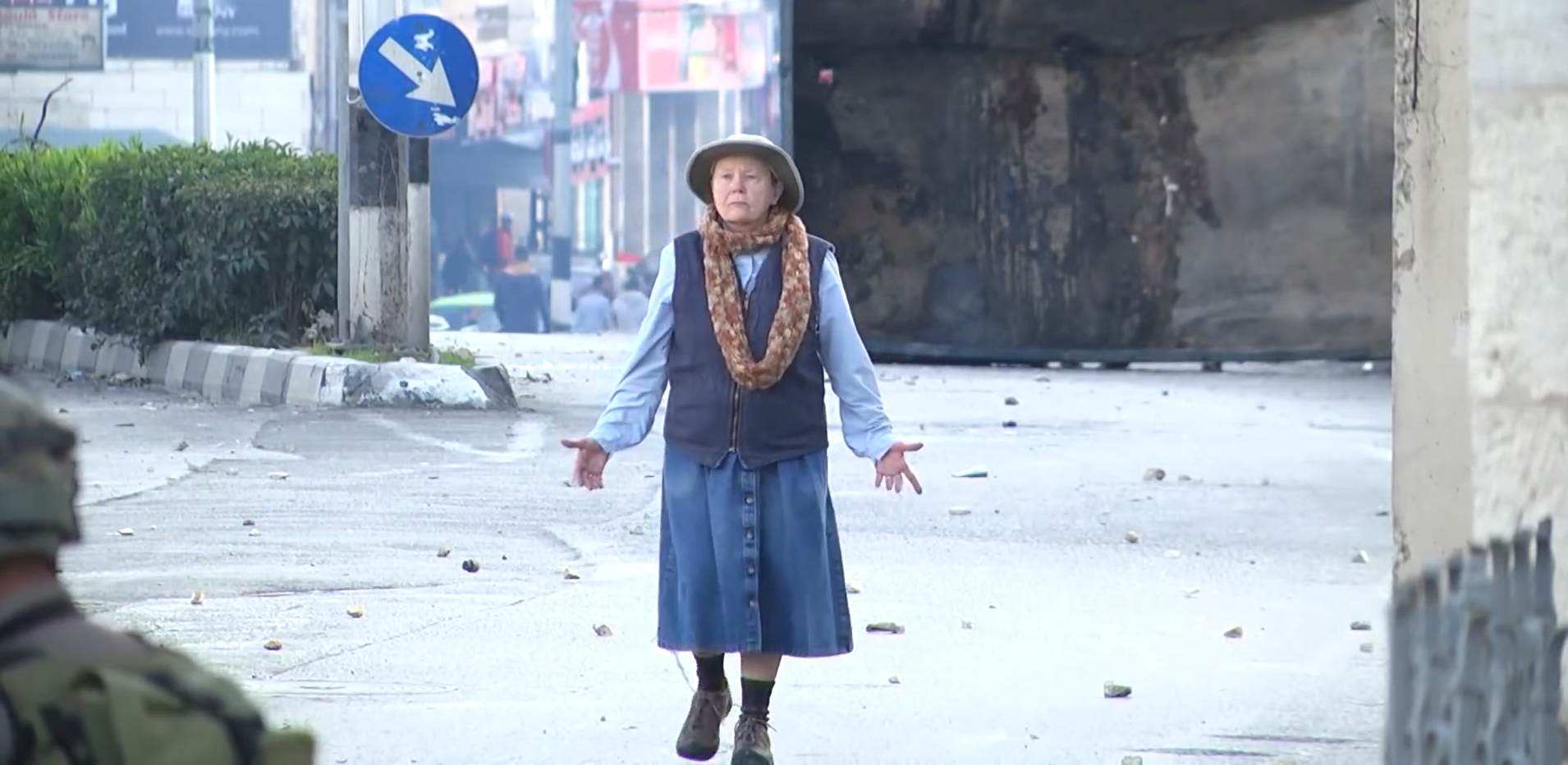 Đoạn video được Ruptly ghi lại ngày 16/12 tại khu Bờ Tây, 1 cụ bà tay không bước đi hiên ngang giữa một bên là Lực lượng Phòng vệ Israel và một bên là những người biểu tình Palestine để cố gắng ngăn chặn xung đột từ 2 phía.