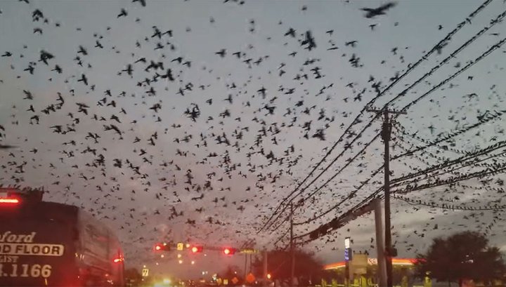 Cư dân thành phố Mesquite, bang Texas, Mỹ được phen hoảng hốt khi bầu trời thành phố này trở nên đen kịt bởi cả ngàn con chim kéo đến. Đoạn video được ghi lại cho thấy cảnh tượng vừa gây kinh ngạc vừa gây hoảng sợ này trên cao tốc đi qua thành phố Mesquite.