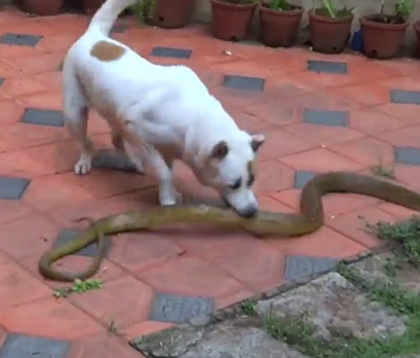 Với nhiệm vụ bảo vệ gia chủ, một chú chó nhà lao vào cắn con rắn trâu khiến đối thủ cố tìm đường thoái lui nhưng đã quá muộn.