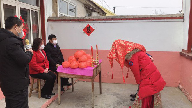Đám cưới đôi vợ chồng trẻ chỉ gồm 6 người, diễn ra ở sân trước nhà cô dâu trong vòng 2 phút.