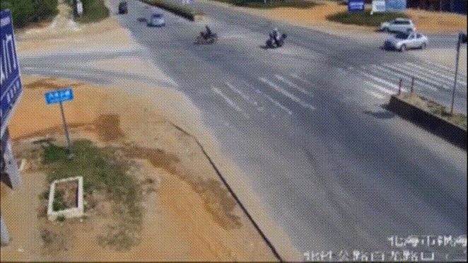 Đâm trúng ô tô, xe máy trượt dài rồi bốc cháy tại một ngã tư ở Quảng Tây, Trung Quốc.